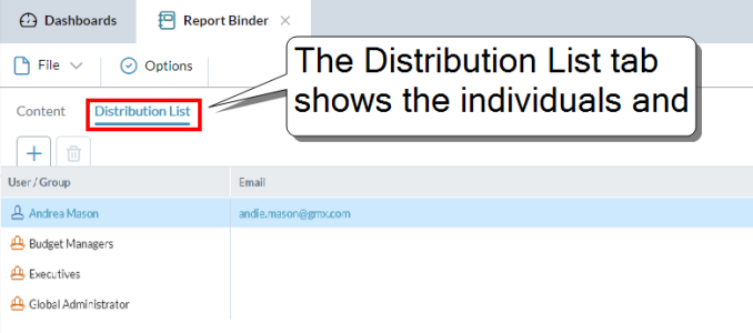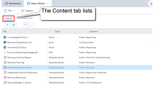 A report binder is actually a type of FP&A Plus file that is two lists: