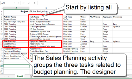 Keep in mind that this process is iterative—it normally requires multiple passes to capture all the tasks. Start with the tasks, and get their order correct. After you have done that, you can group the tasks into activities. At this point you can also look for "contingencies" (that is, situations where the overall process should move forward only when a set of tasks is complete). In those cases, you should put that set of tasks into the same group.