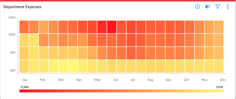 Heat Map charts are useful for visualizing data intensity over time or across dimensions, such as region, department, or product line, and thus support strategic planning, resource allocation, and performance monitoring.