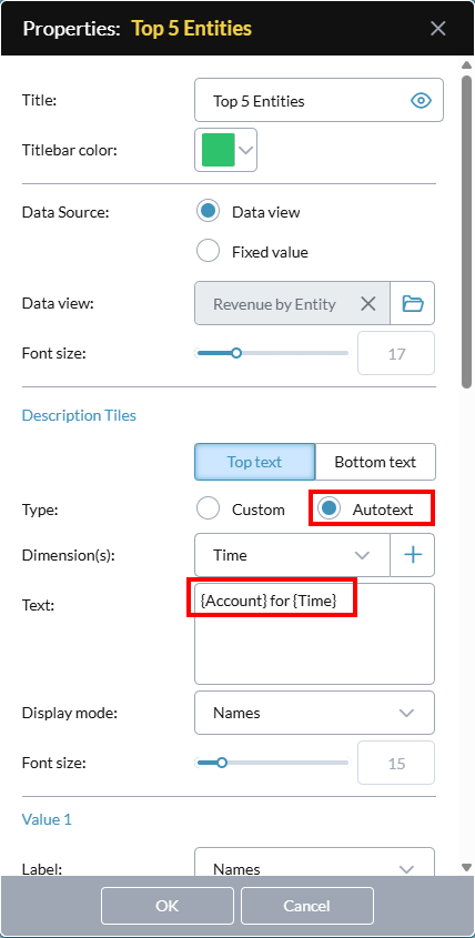 - To add static text above the Value, click Top text and type the Text.