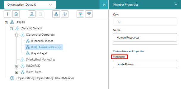 The following image shows a parent-child dimension (Organization) with the custom member property Manager: