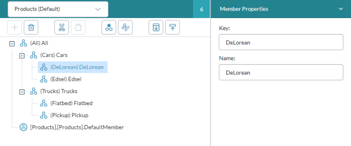 The next image shows a level-based dimension (Product) consisting of two levels (Category and Product); the members in the upper level are all product categories (Cars, Trucks) and the members at the bottom level are individual products (Delorean, Flatbed, and so on):