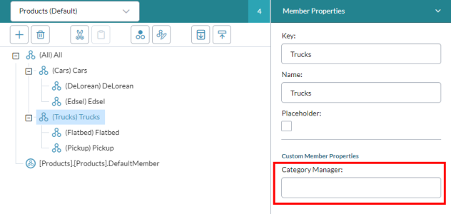 If we want to add the custom member property Manager to Products, the same as above for Organization, we must add it at each level. But after adding it for one level (Catergory), at the next level (Product) we encounter the following: