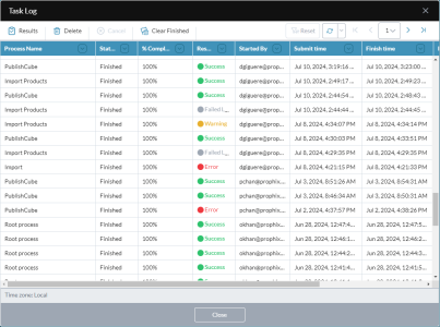 The Task Log shows the status of all running or completed processes. The log lists 100 processes per page, starting with the most recent.