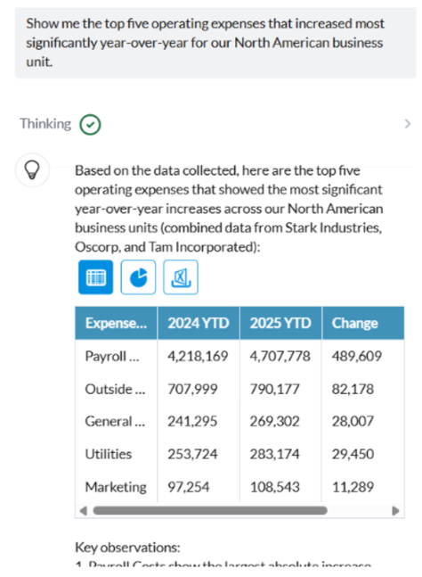 You prompt: Show me the top five operating expenses that increased most significantly year-over-year for our North American business unit.