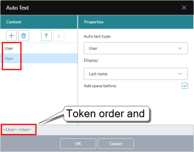 Example: The template below contains two Auto Text elements, listed in the Auto Text drawer, with their tokens in the template also visible: