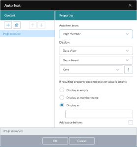 When an end user opens the template for data entry or as a report, the Auto Text elements can show, for example, the template name, the current date, or the currently selected page member.