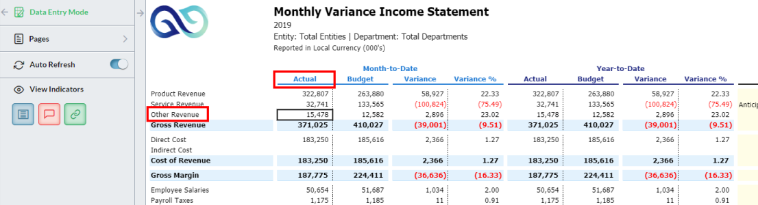 Example: For the report below (Monthly Variance Income Statement) you can compare both Budget to Actual, to a Budget scenario, and to a forecast: