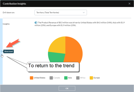 When you see a value in a report and want to understand the factors driving it, you can call up a contribution insight—a mini report that contains a narrative summary along with a chart. (Contribution Insights are similar to Chart Insights.)
